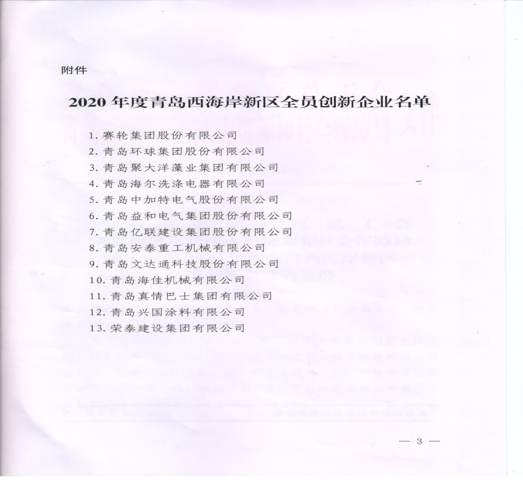 青島西海岸新區(qū)總工會(huì)、青島西海岸新區(qū)人力資源和社會(huì)保障局下發(fā)的《關(guān)于命名2020年度青島西海岸新區(qū)全員創(chuàng)新企業(yè)的通報(bào)》中,榮泰建設(shè)集團(tuán)有限公司位居“2020年度青島西海岸新區(qū)全員創(chuàng)新企業(yè)”名單之列,并獲得10萬元鼓勵(lì)資金。